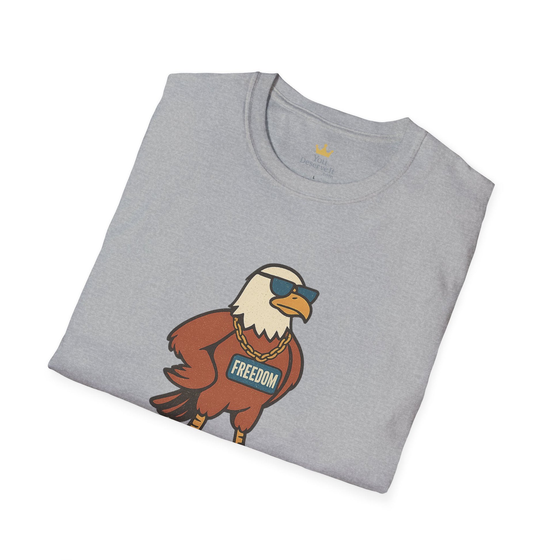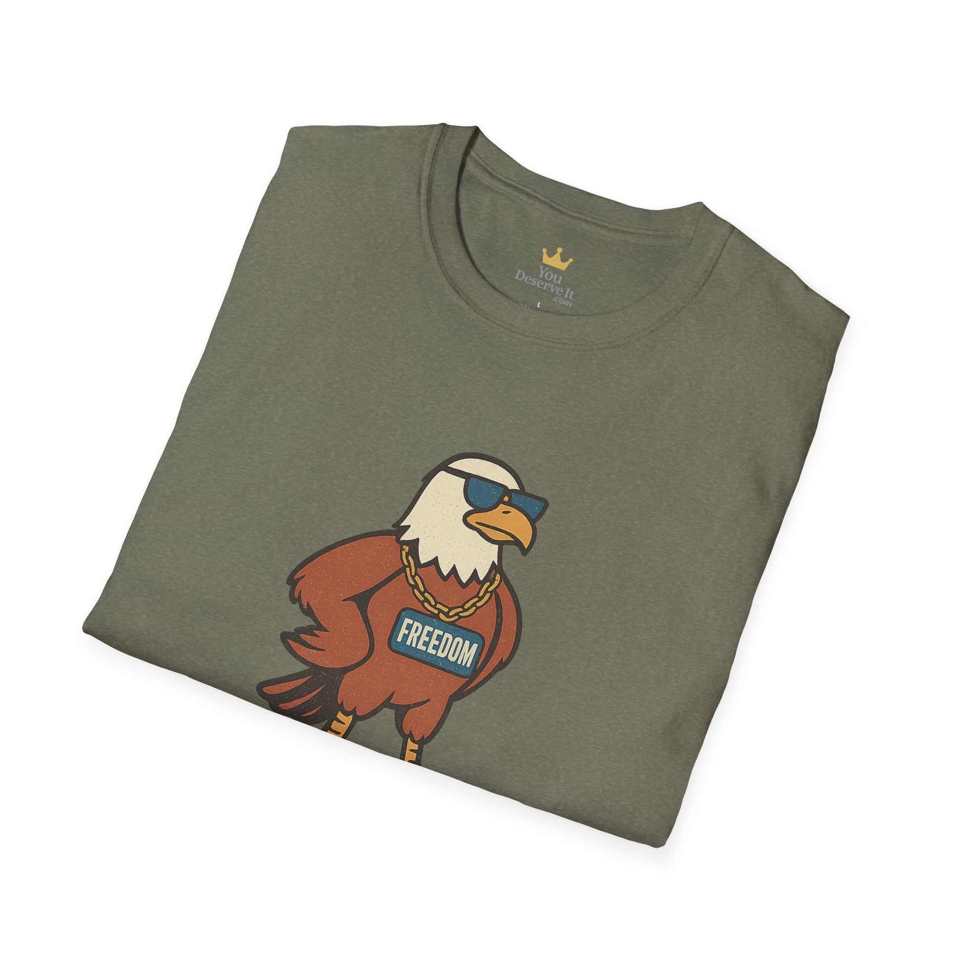 Featuring a swaggering bald eagle with shades, a gold chain, and a chest that screams FREEDOM, this shirt is built for the unapologetically American.