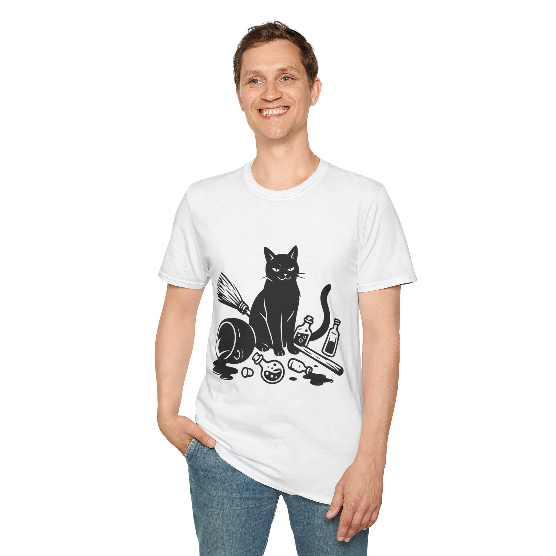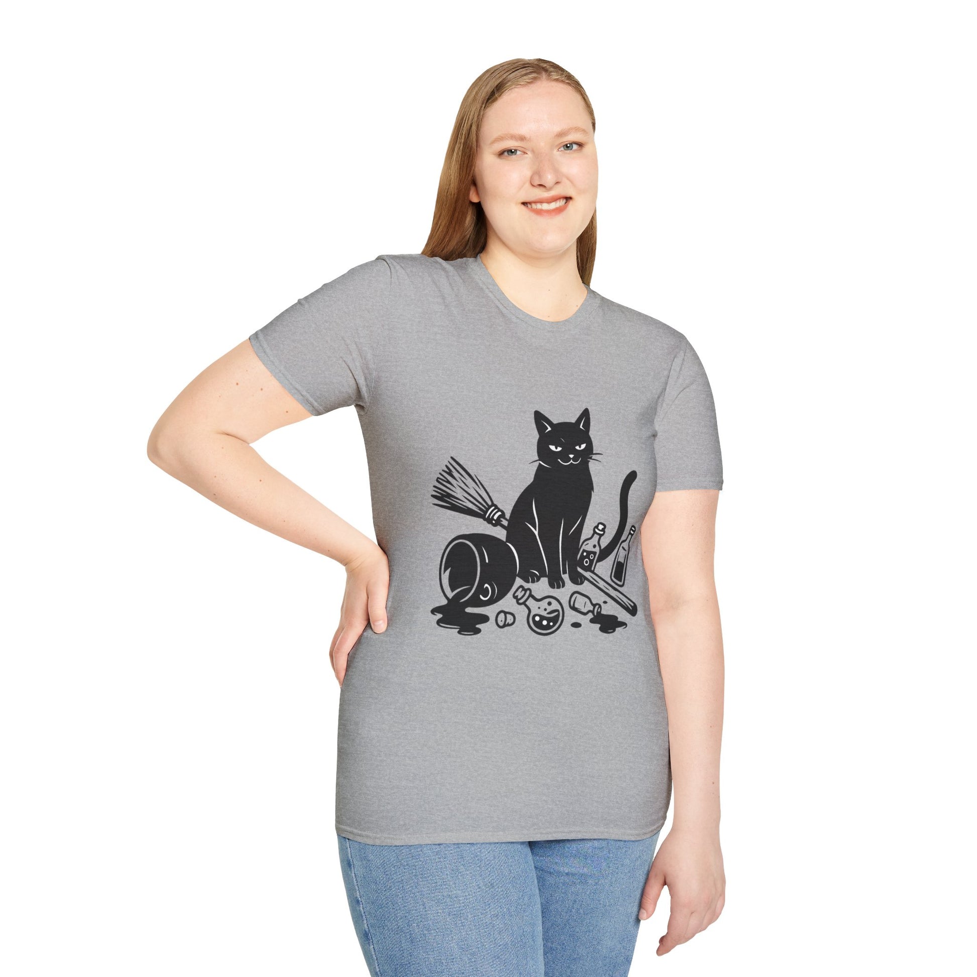 Bring spooky mischief to your wardrobe with this hilarious black cat Halloween design. Featuring a smug black cat amid spilled potions, a broken broom, and an overturned cauldron, this print-ready transparent image is perfect for shirts, mugs, and more. Ideal for cat lovers, witches, and anyone who enjoys a bit of magical chaos. This shirt is ideal for cat lovers and is suitable for all gender expressions, adding a touch of personality to any wardrobe. With its breathable, lightweight fabric, this tee is a must-have for any season and a great gift for birthdays, Halloween, or just to celebrate your love for cats. Its classic fit ensures a versatile look that pairs effortlessly with jeans, shorts, or leggings. Feel the comfort and joy every time you wear it!
