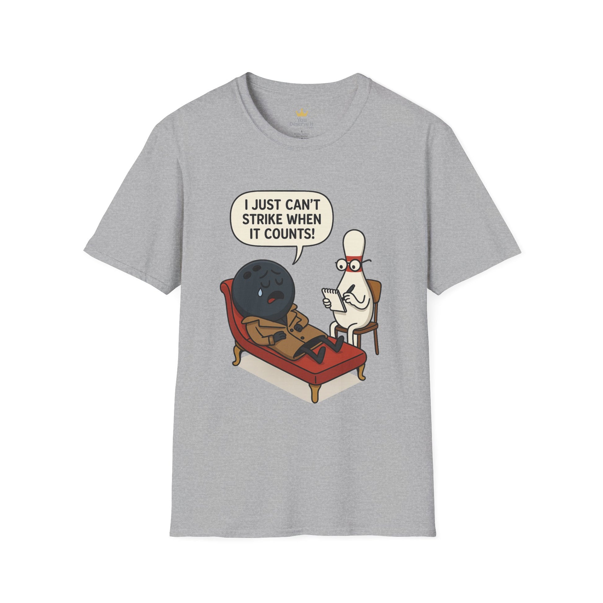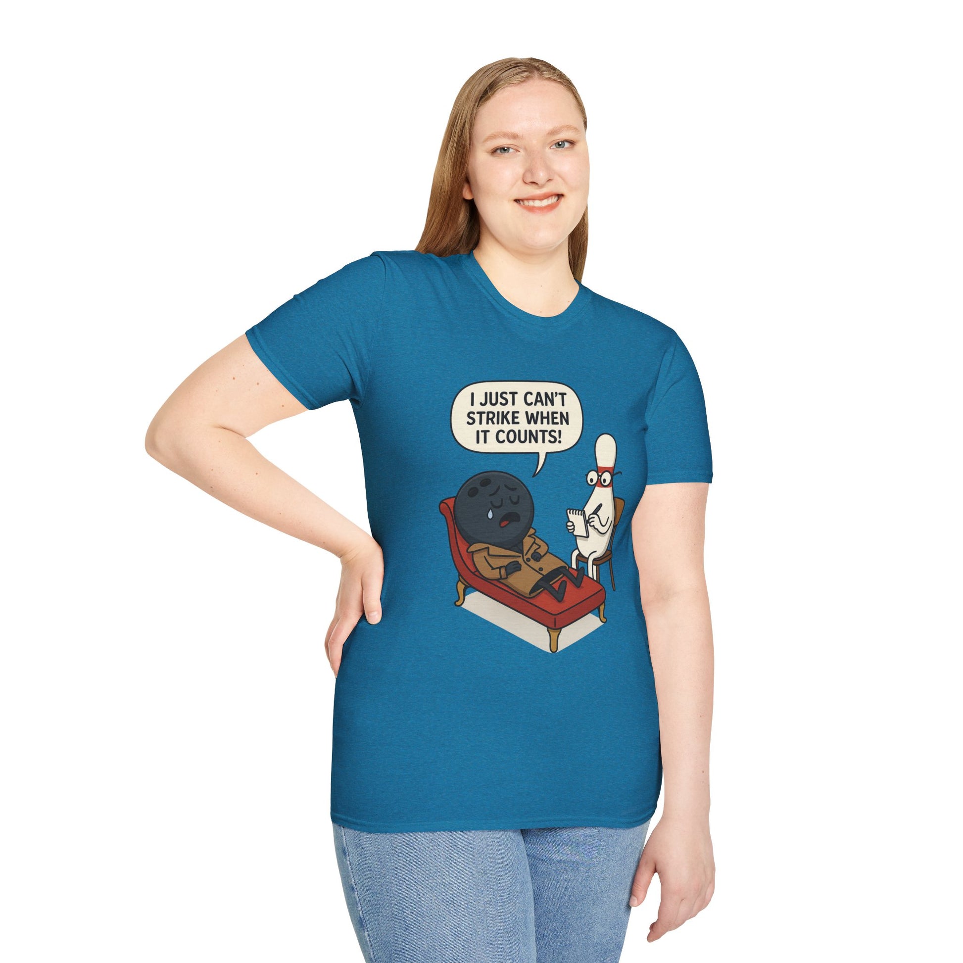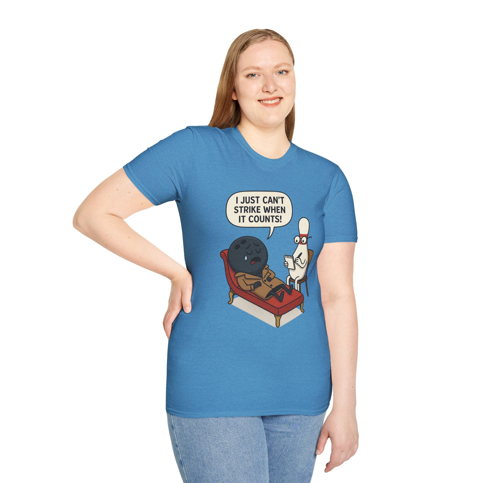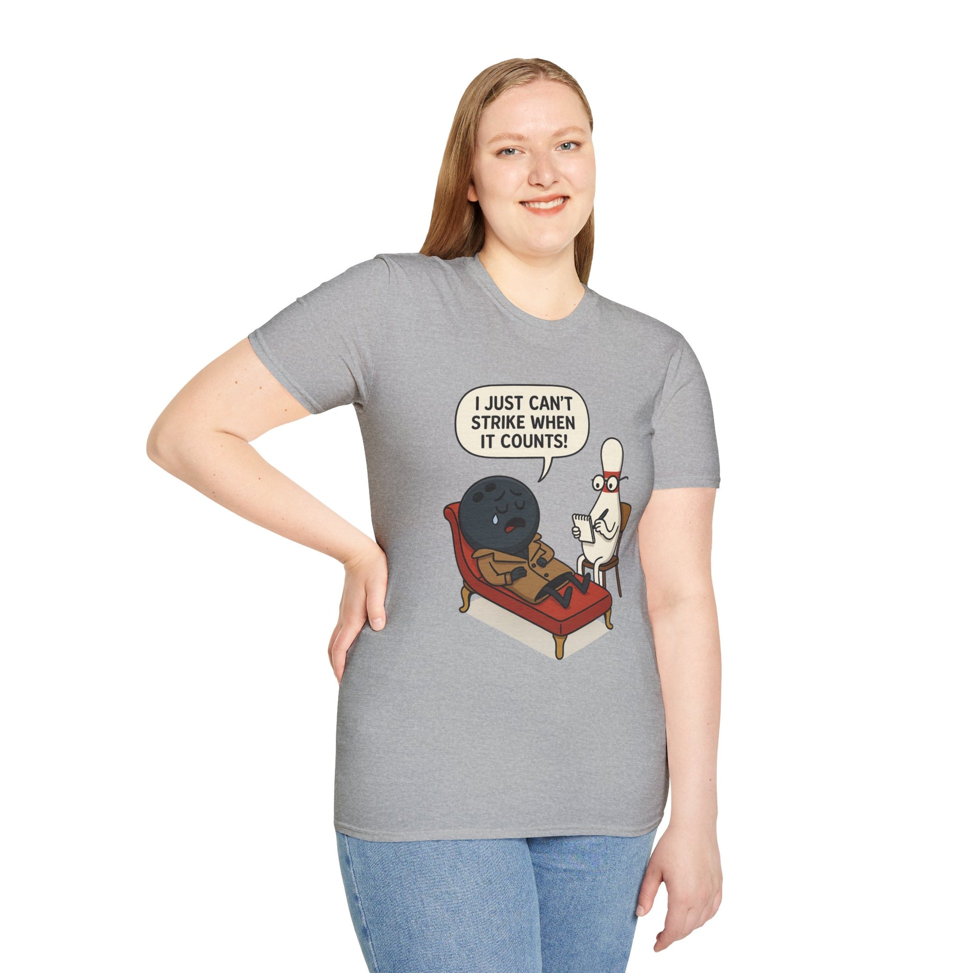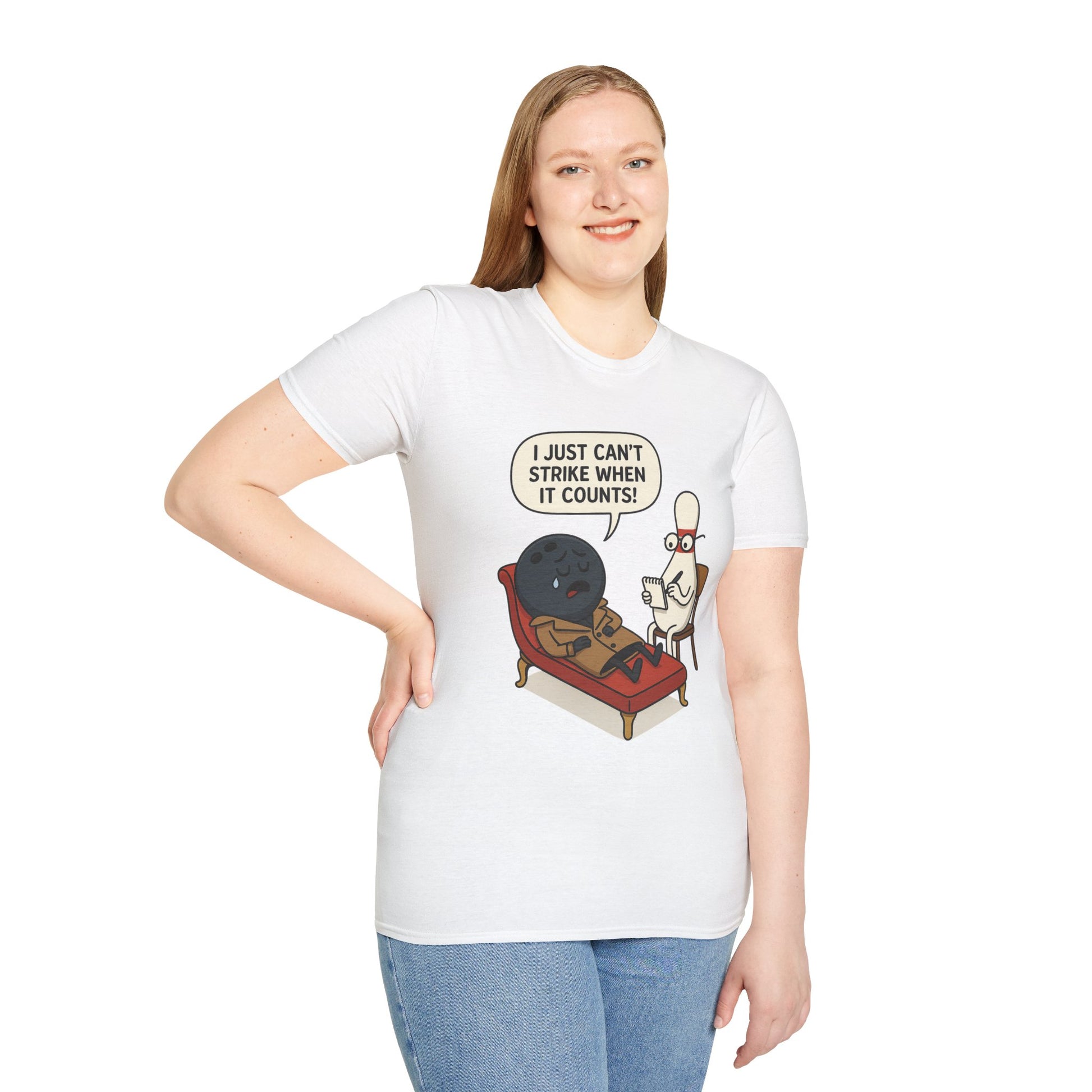 Funny Bowling T-Shirt | "I Just Can't Strike When It Counts!" Therapy Cartoon Tee