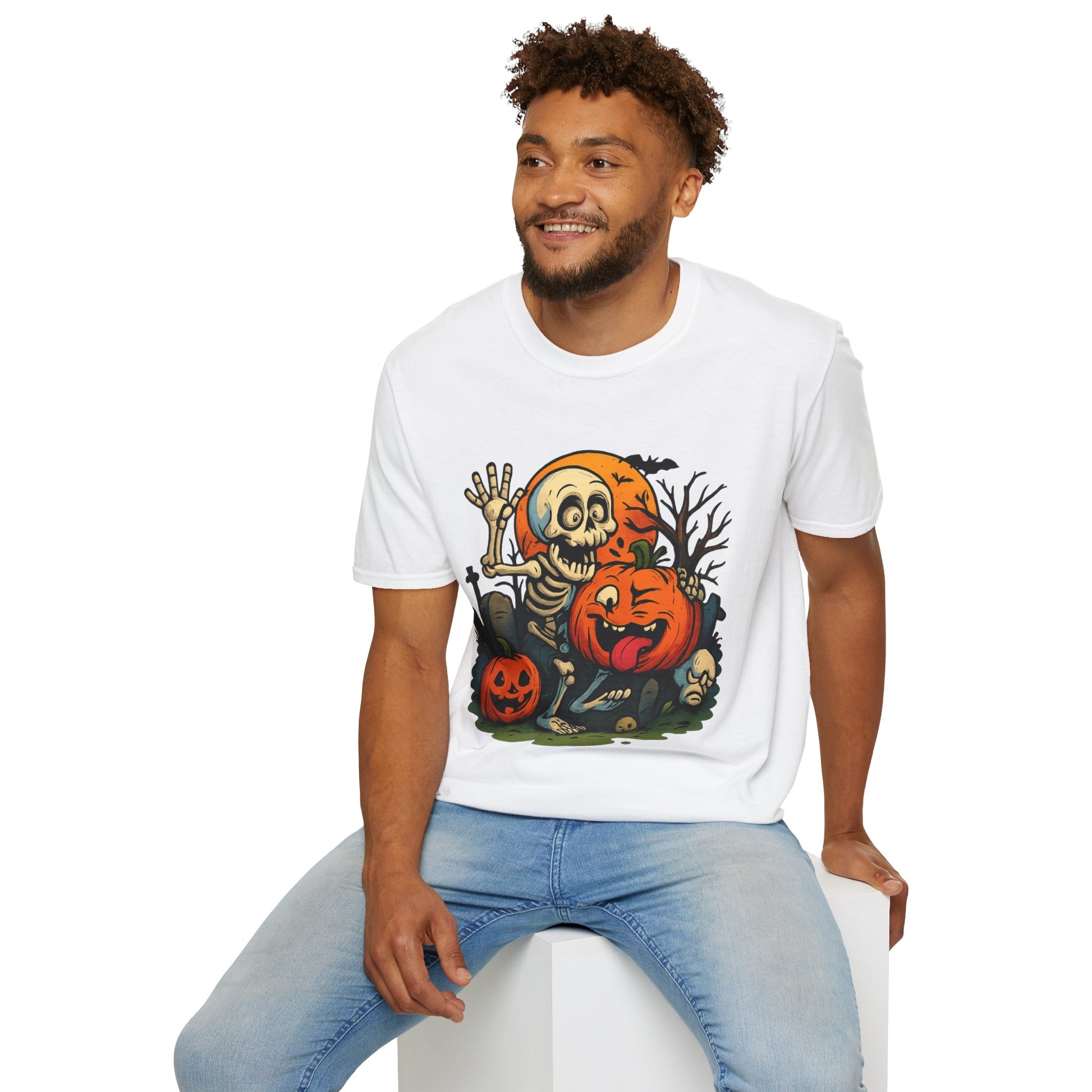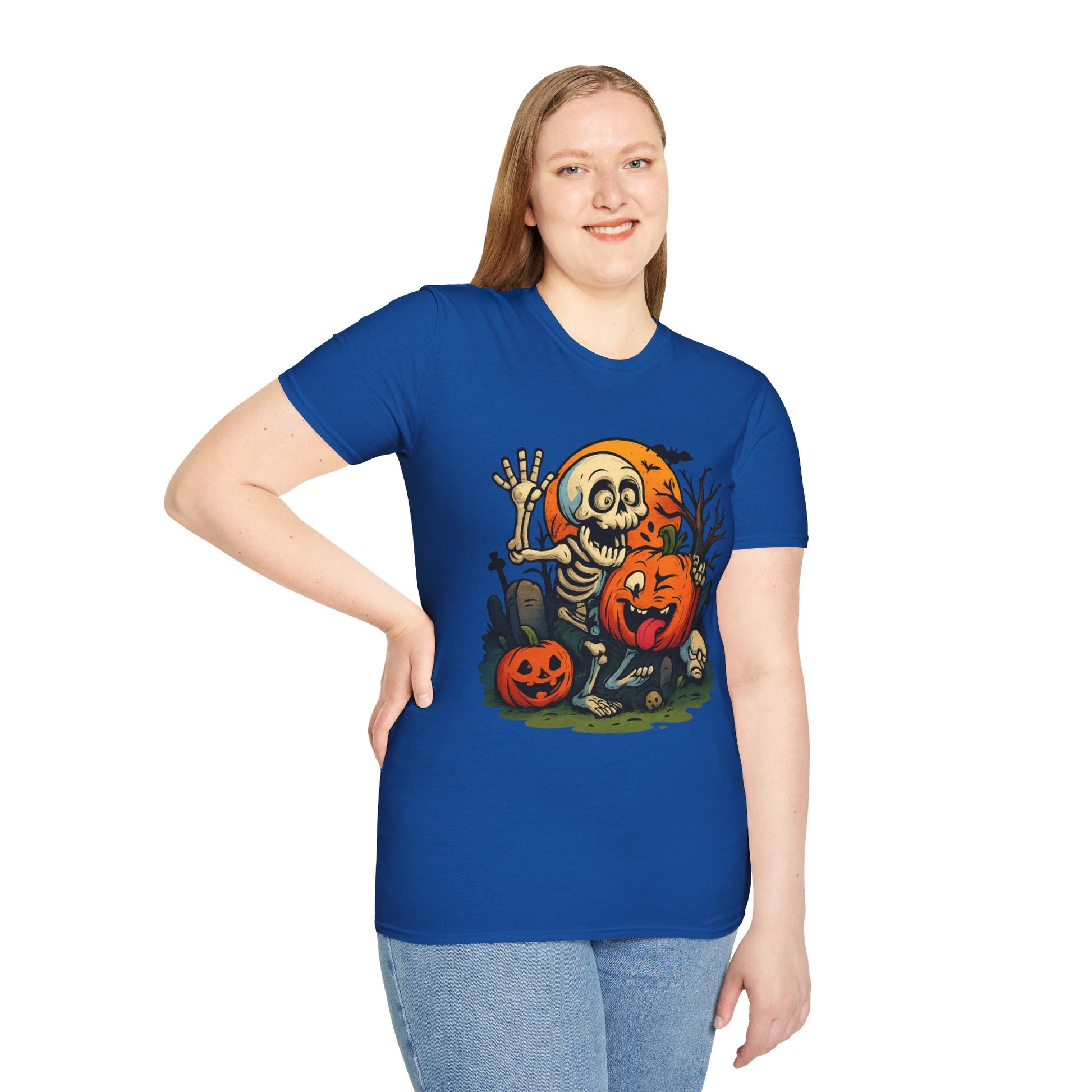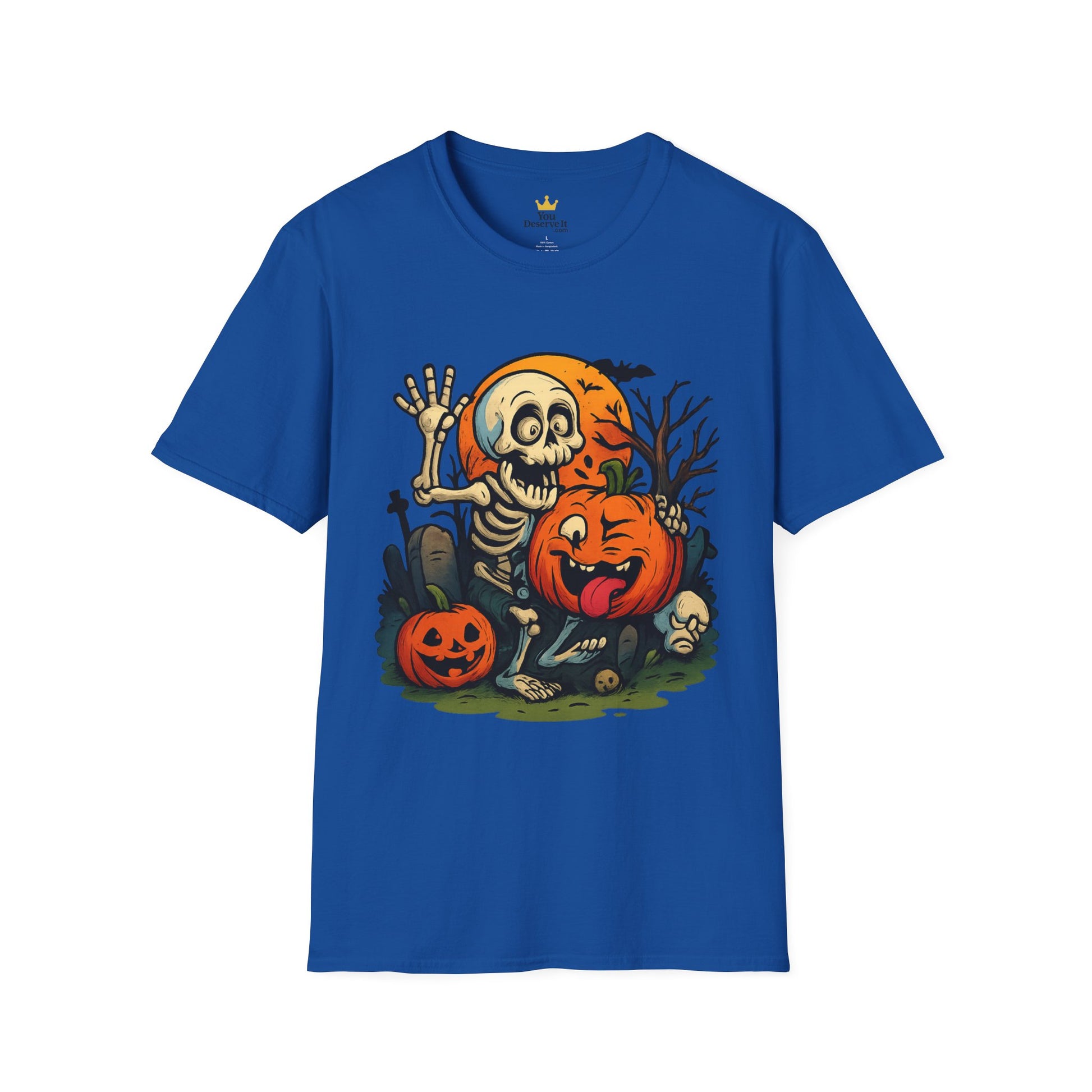 Funny Halloween Skeleton & Pumpkin T-Shirt – Cute Spooky Comic Design