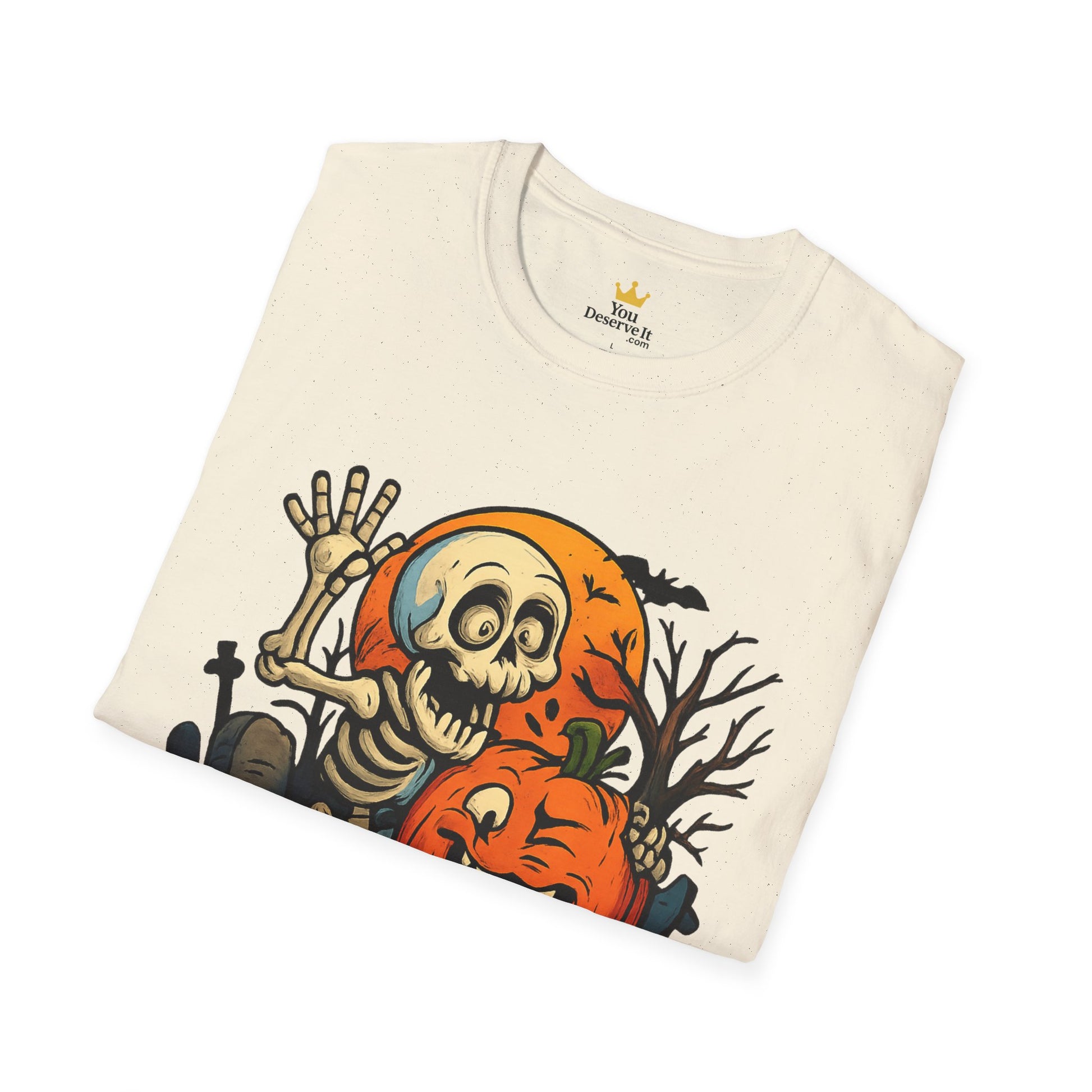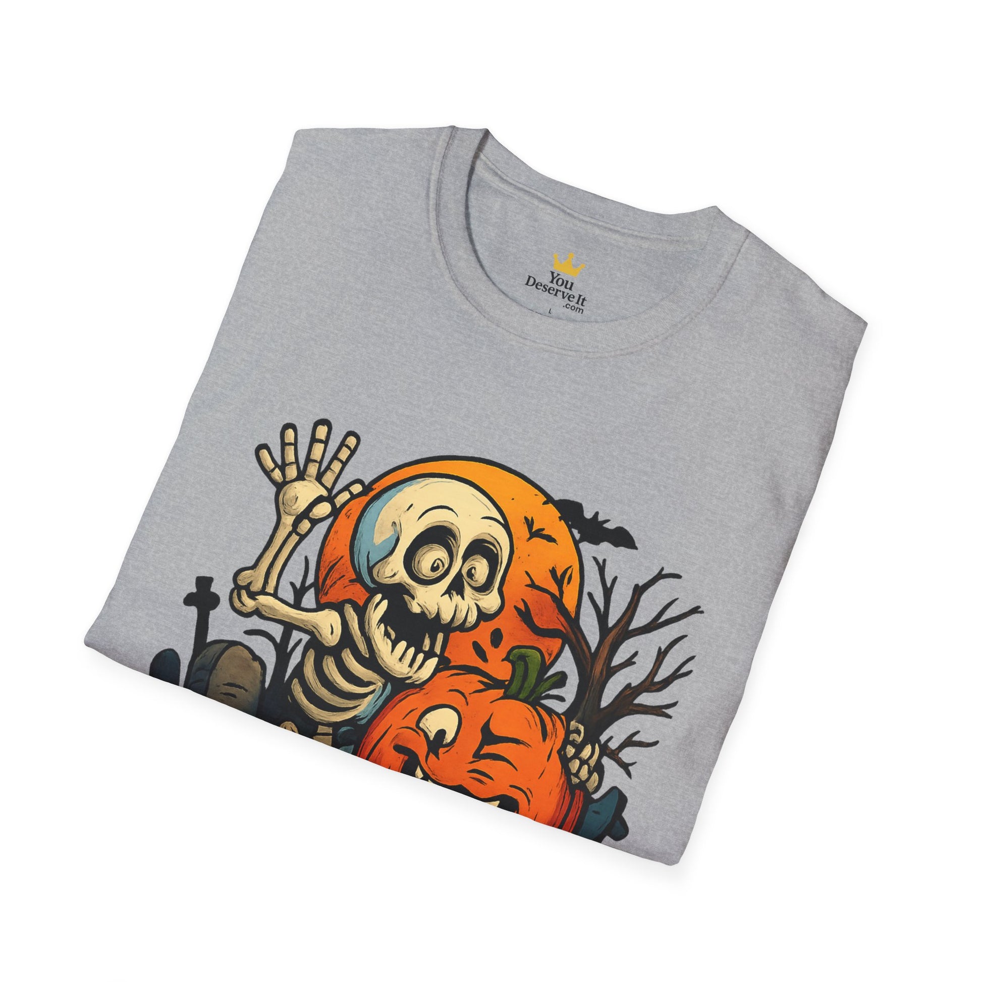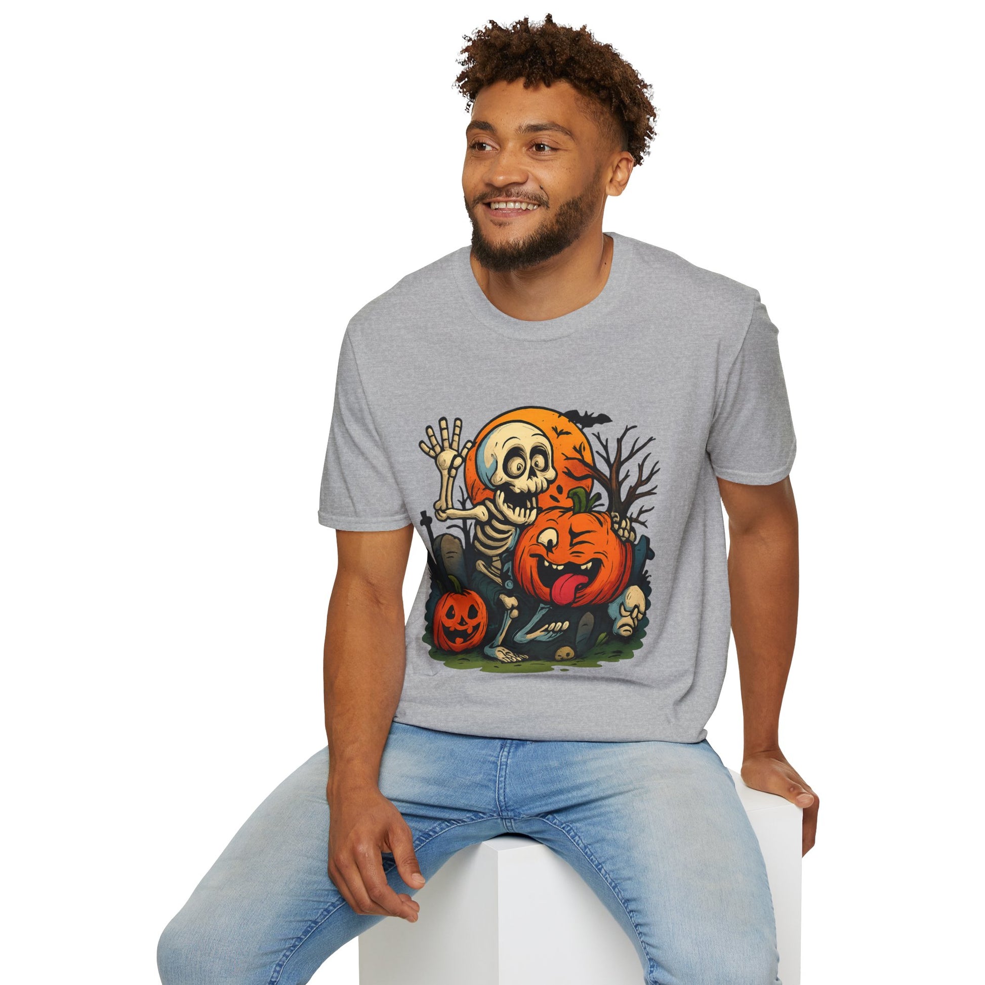 Funny Halloween Skeleton & Pumpkin T-Shirt – Cute Spooky Comic Design