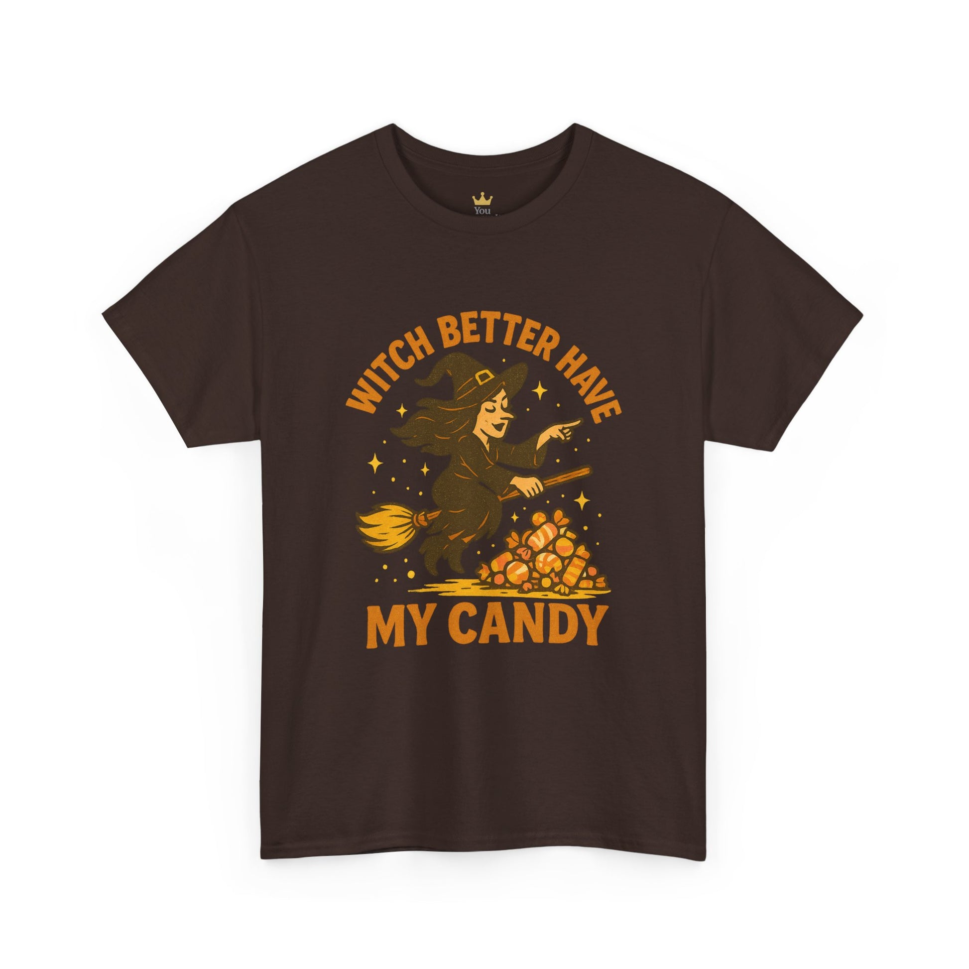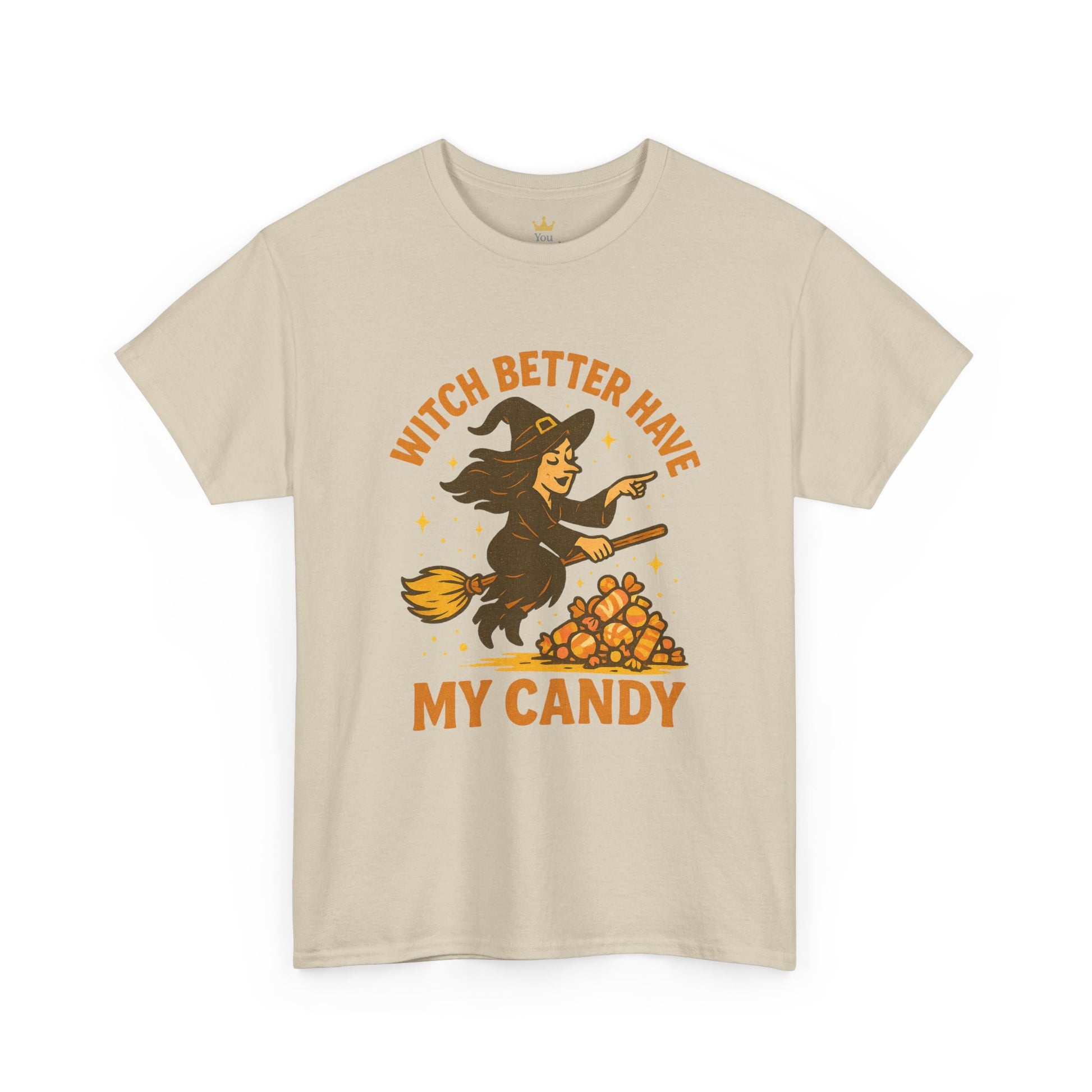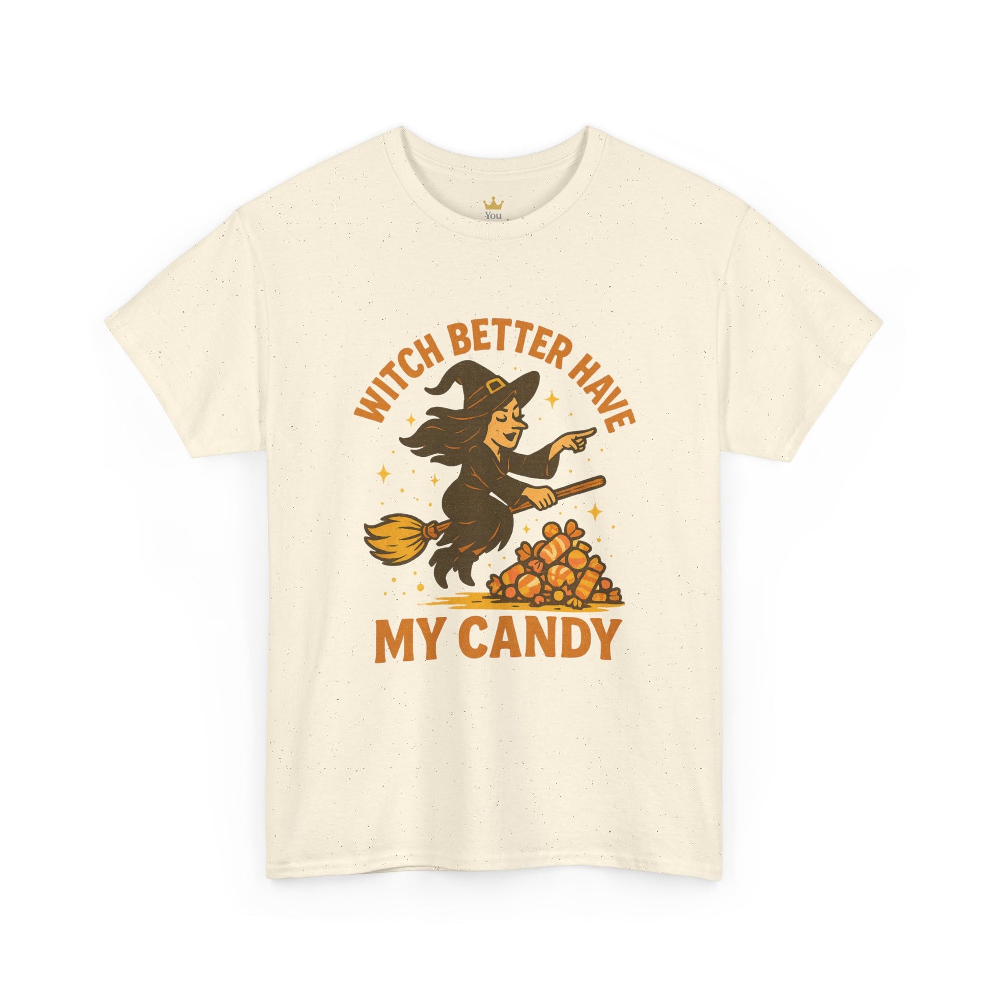No tricks, just treats—and don’t test this witch’s patience. Featuring a candy-loving broom rider and a cheeky demand, this Halloween tee is perfect for the bold, the sweet-toothed, and anyone who takes candy season seriously. Great for parties, pumpkin patches, or just bossing around the candy bowl.