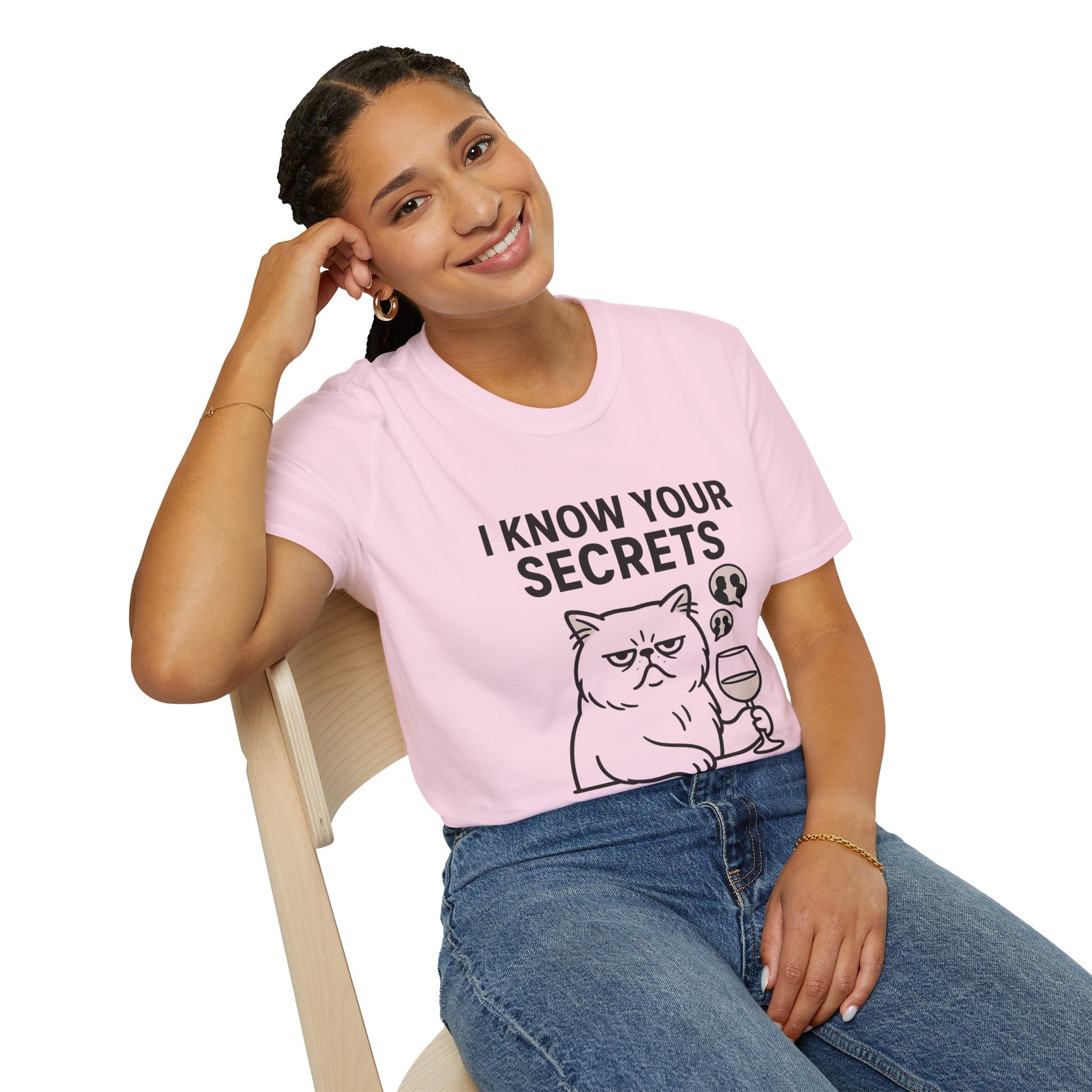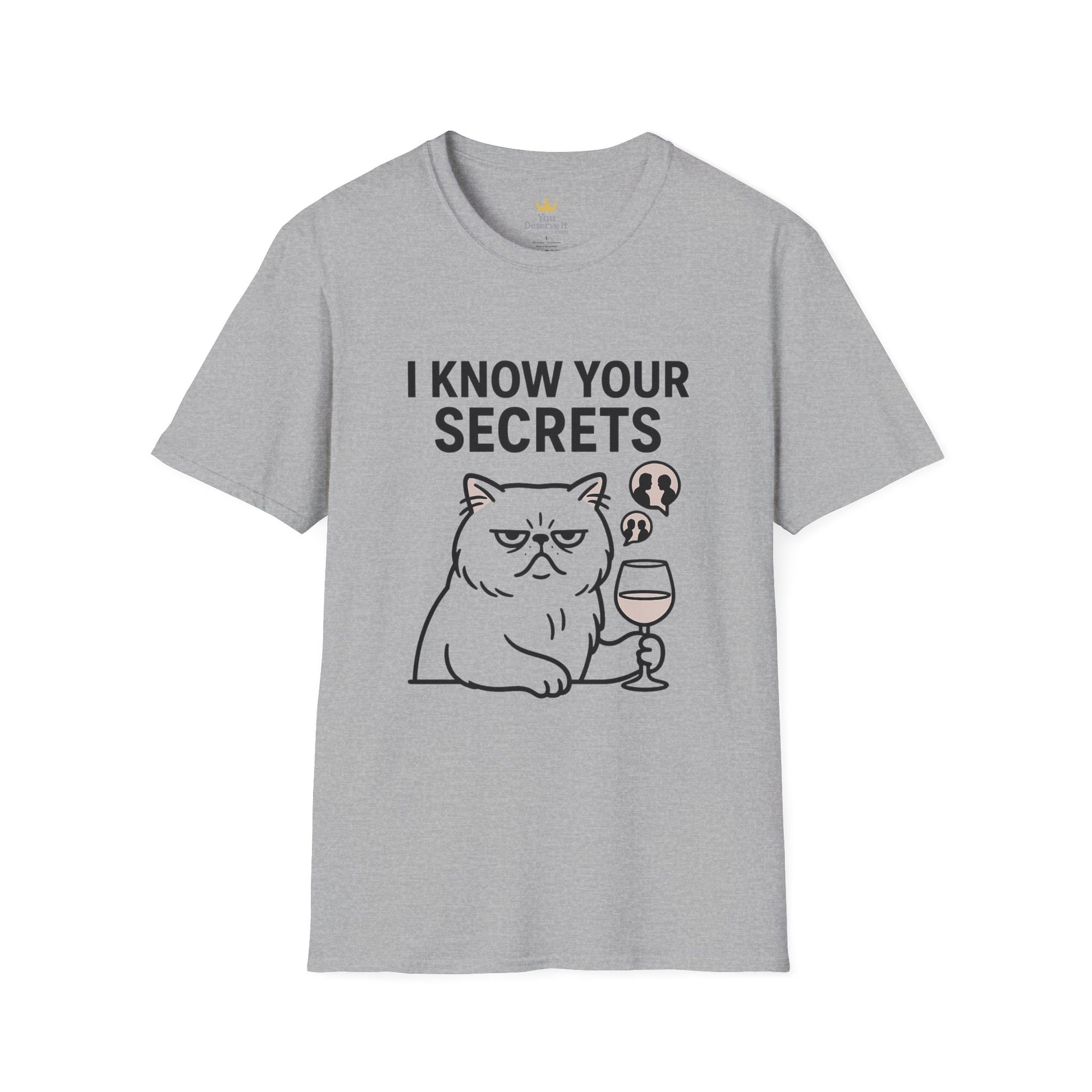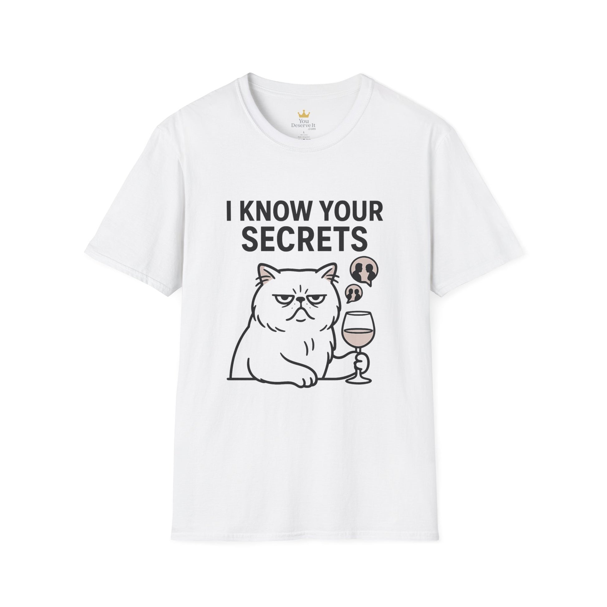 "I Know Your Secrets" Wine Cat T-Shirt, Humor Shirt, Gift for Cat Lovers, Cute Animal Tee, Unique Graphic T-Shirt