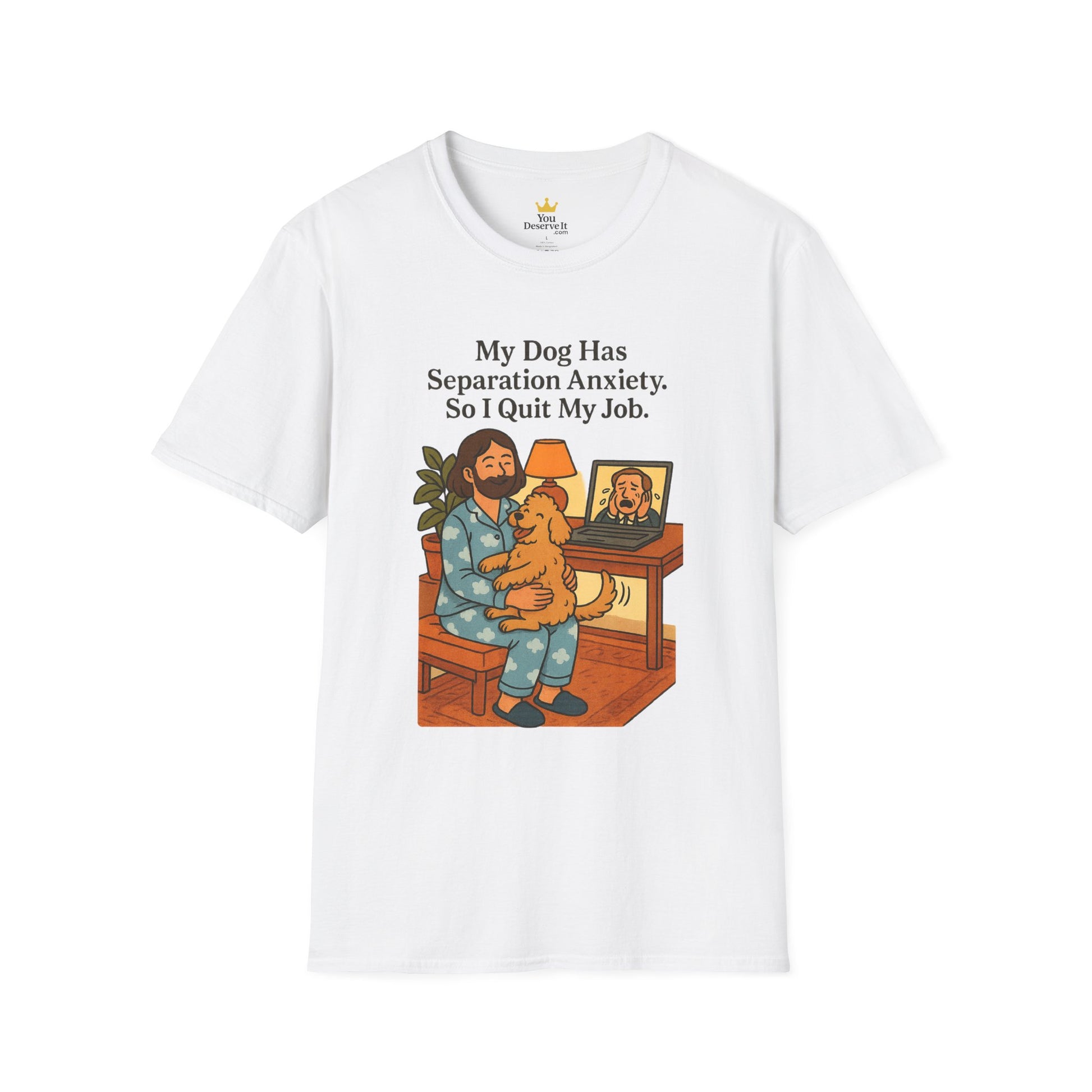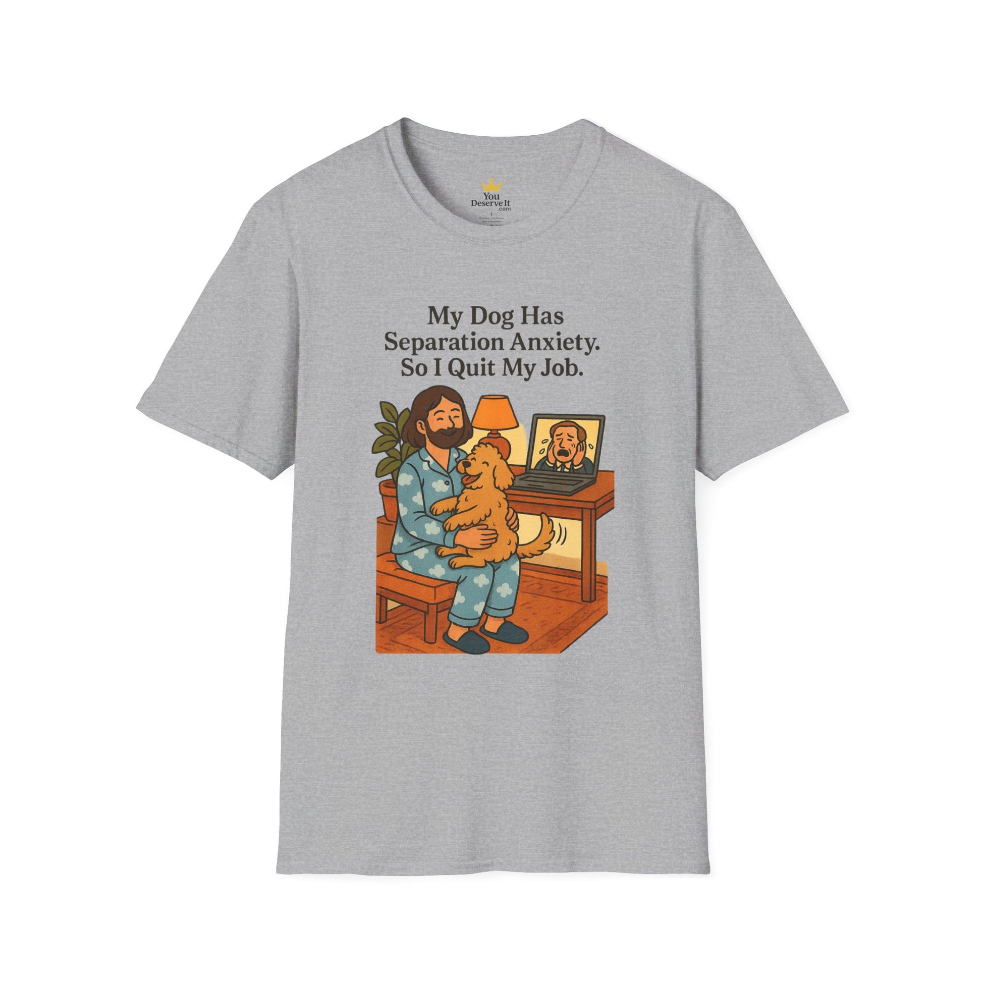 Show your ultimate dog devotion with this hilarious “My Dog Has Separation Anxiety. So I Quit My Job” T-shirt! Perfect for pet parents, dog lovers, and anyone who'd gladly trade Zoom calls for belly rubs. High-quality graphic tee with bold text and playful illustration – great gift for dog moms, dog dads, and remote work rebels.