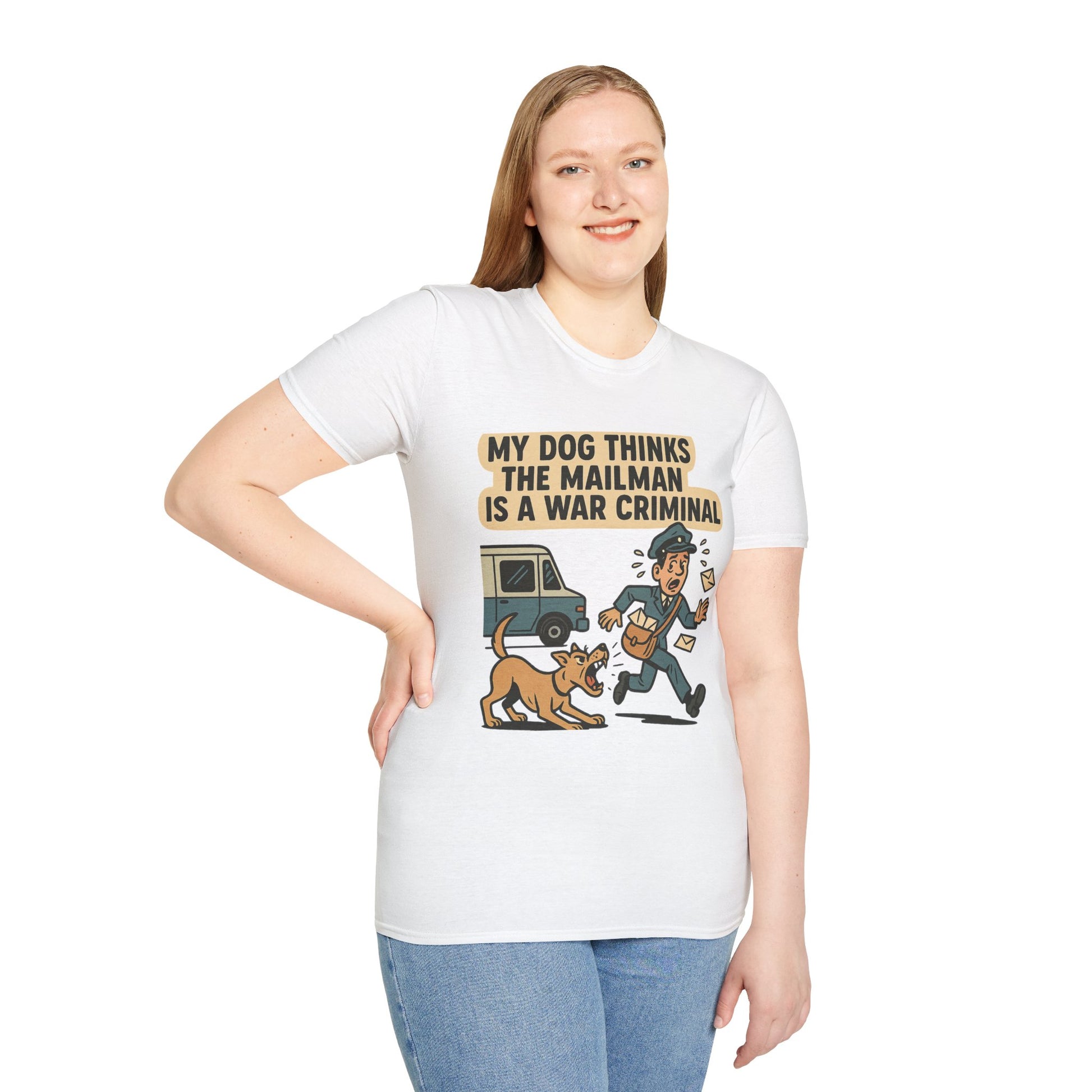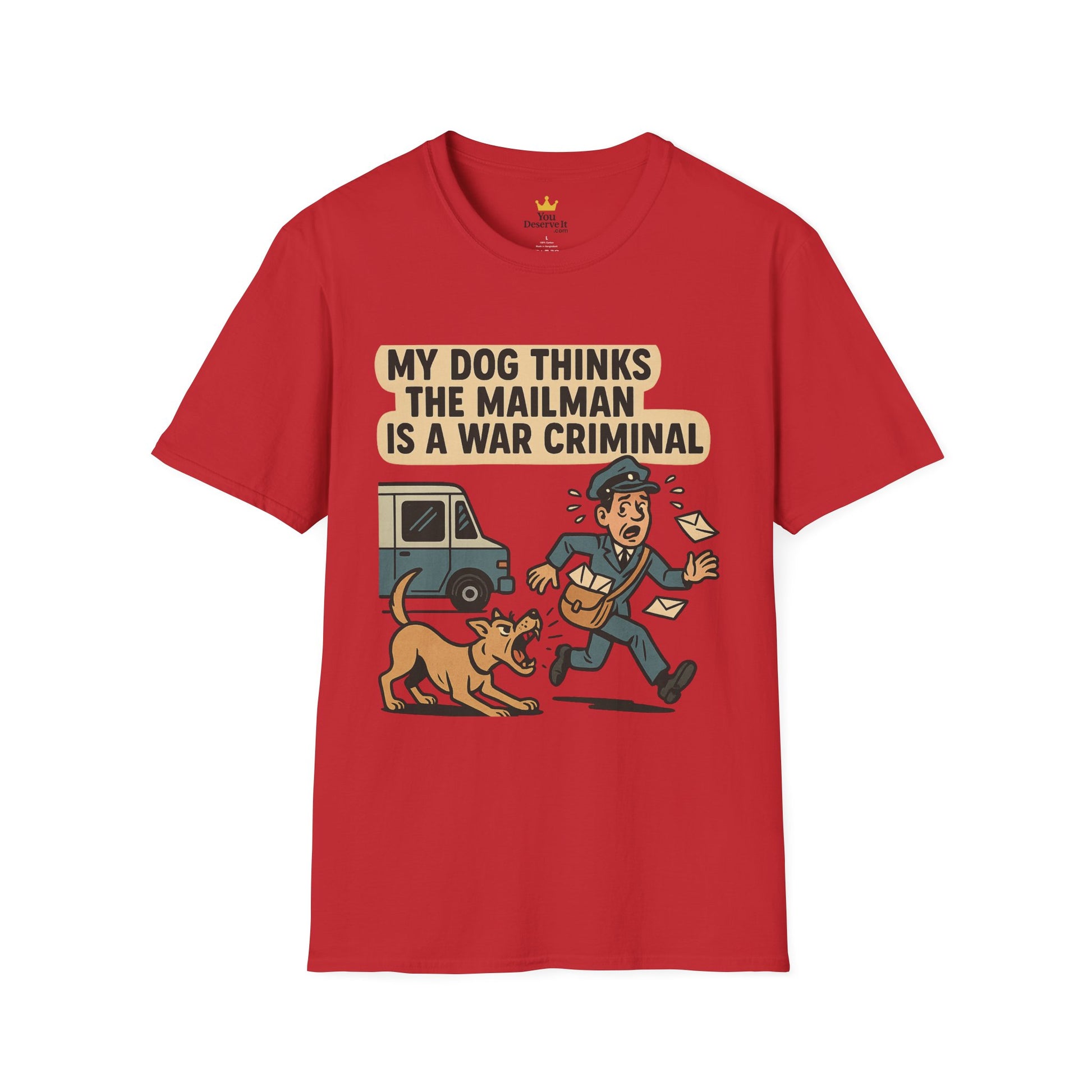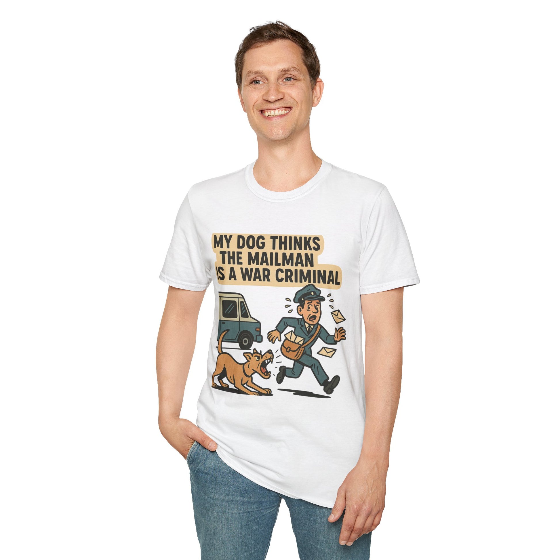 My Dog Thinks the Mailman Is a War Criminal – Funny Retro Comic Dog Owner T-Shirt