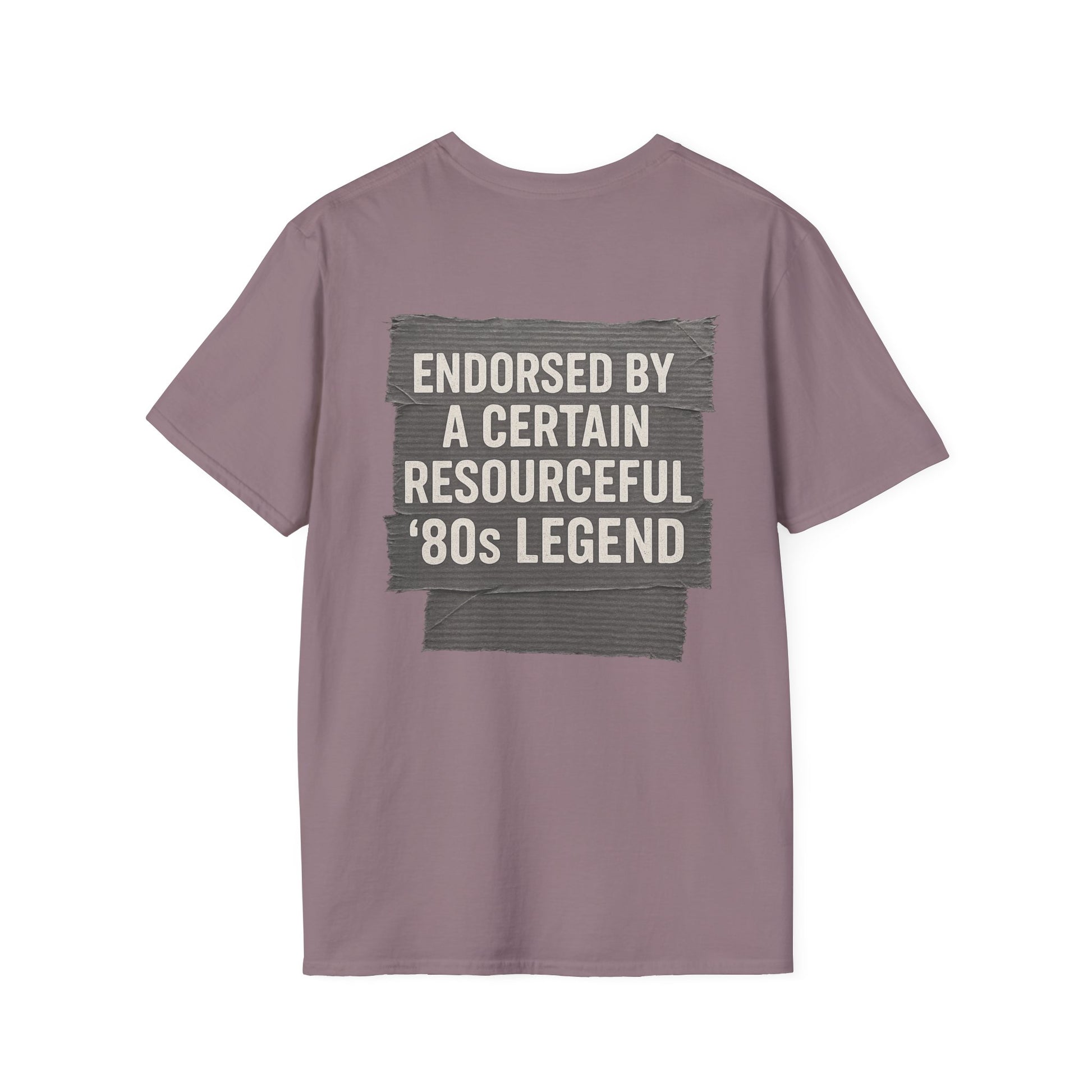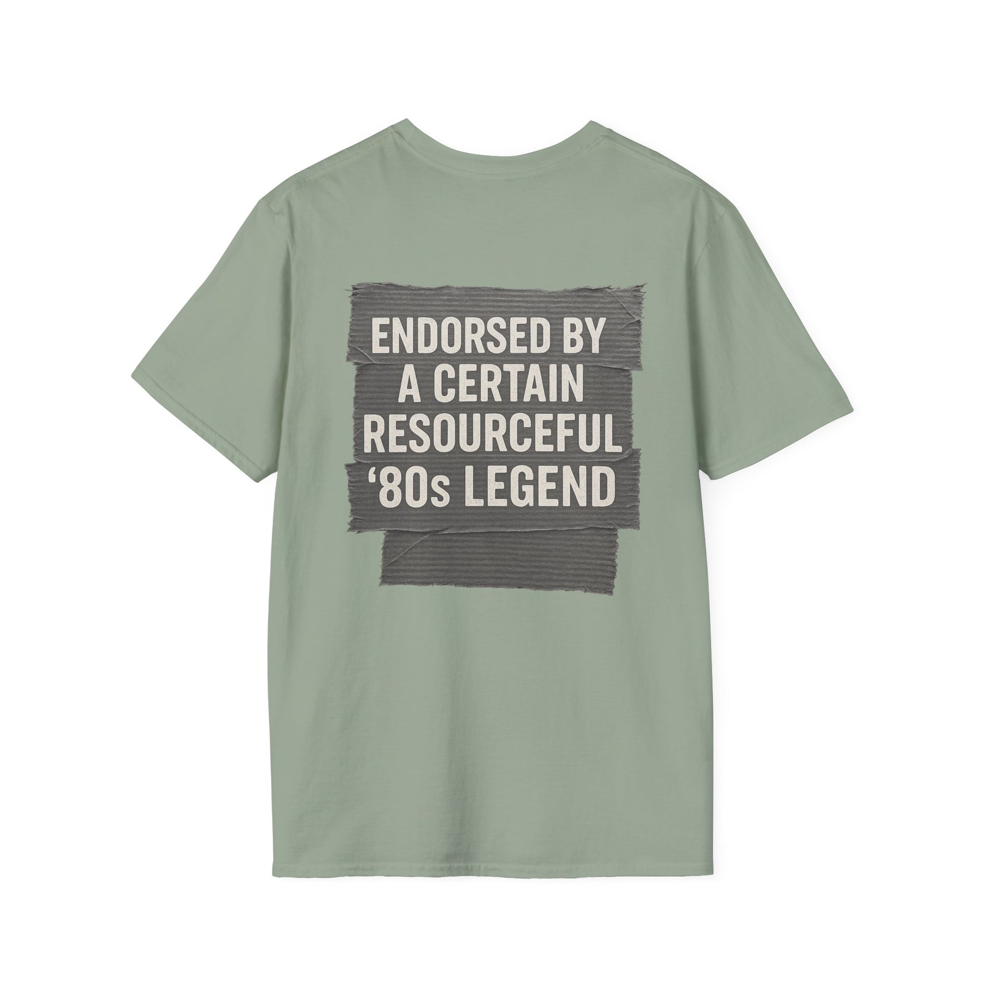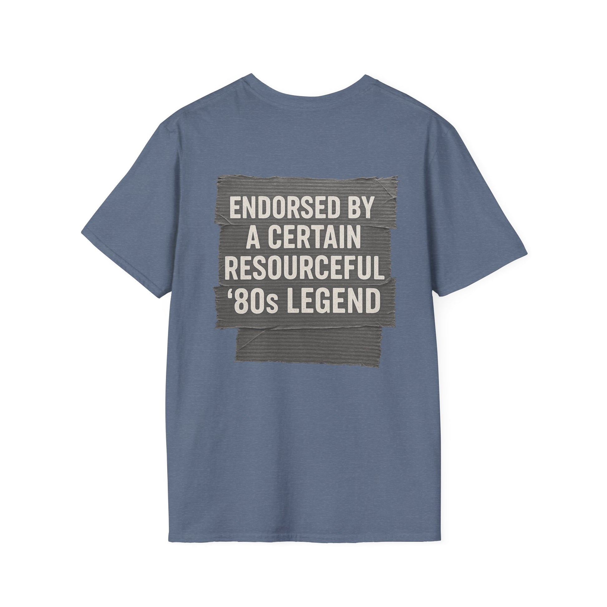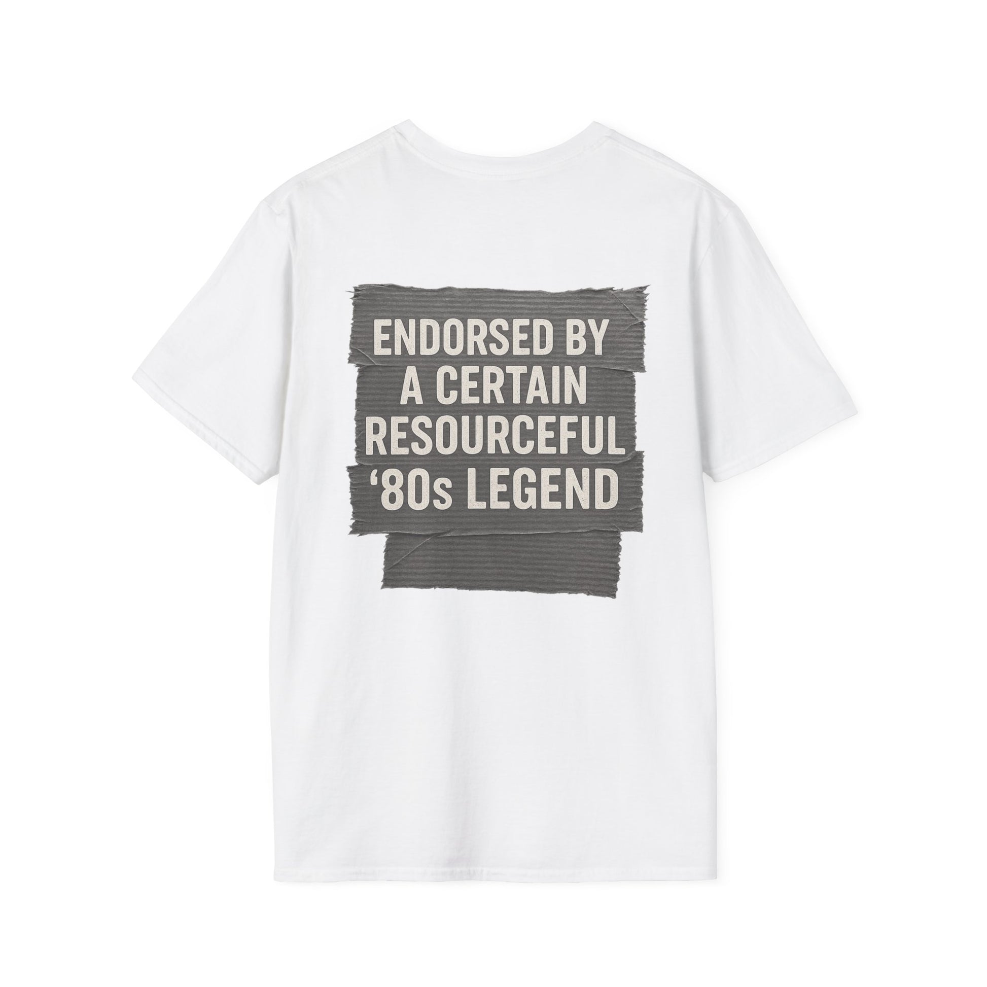 Back: A stealthy nod to a legendary 1980s fixer-upper—“ENDORSED BY A CERTAIN RESOURCEFUL '80s LEGEND”—printed over distressed tape strips.